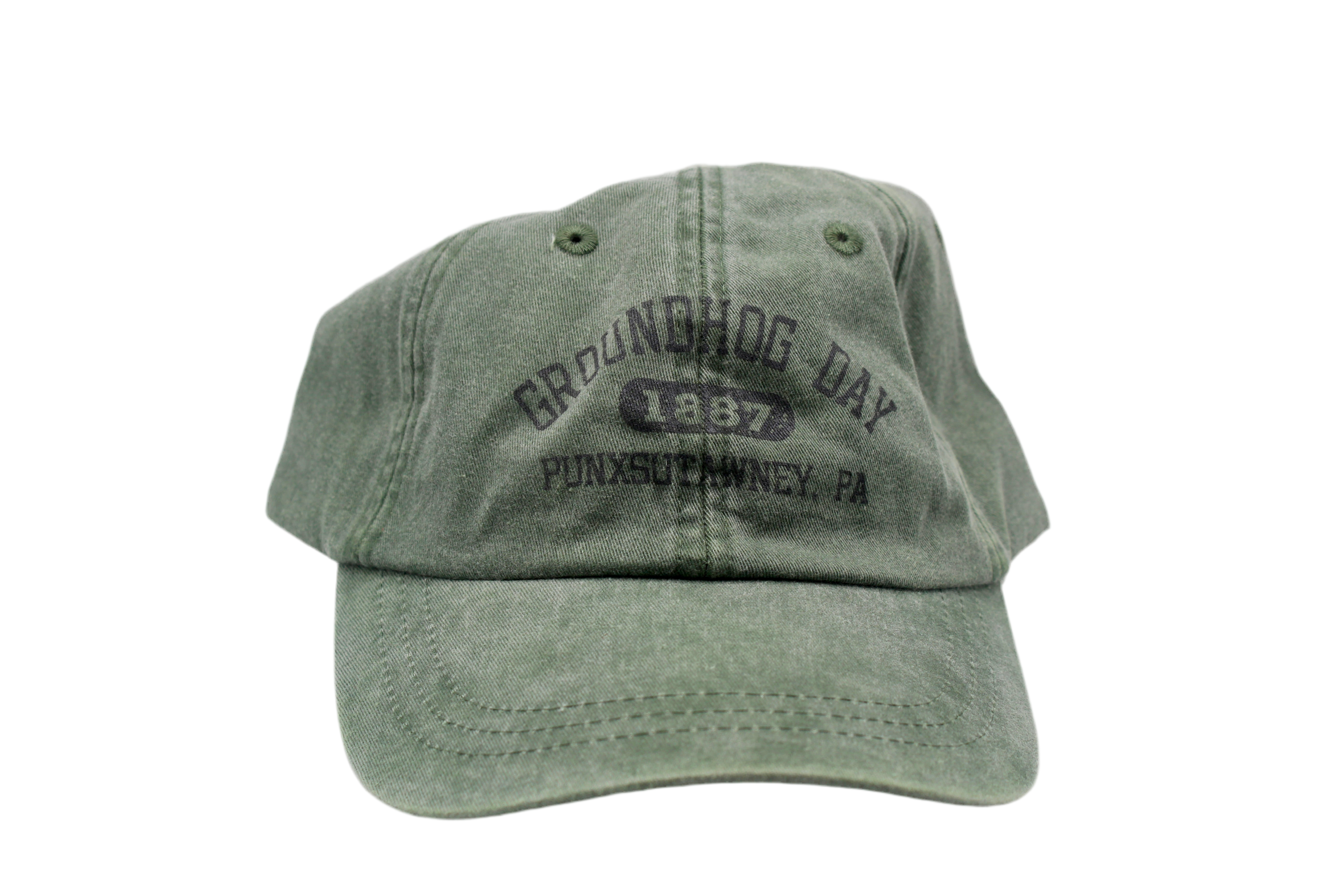 Adjustable ball cap in a washed-out spruce color featuring 'Groundhog Day 1887 Punxsutawney, PA' in light gray lettering. A stylish nod to the tradition with a vintage look.
