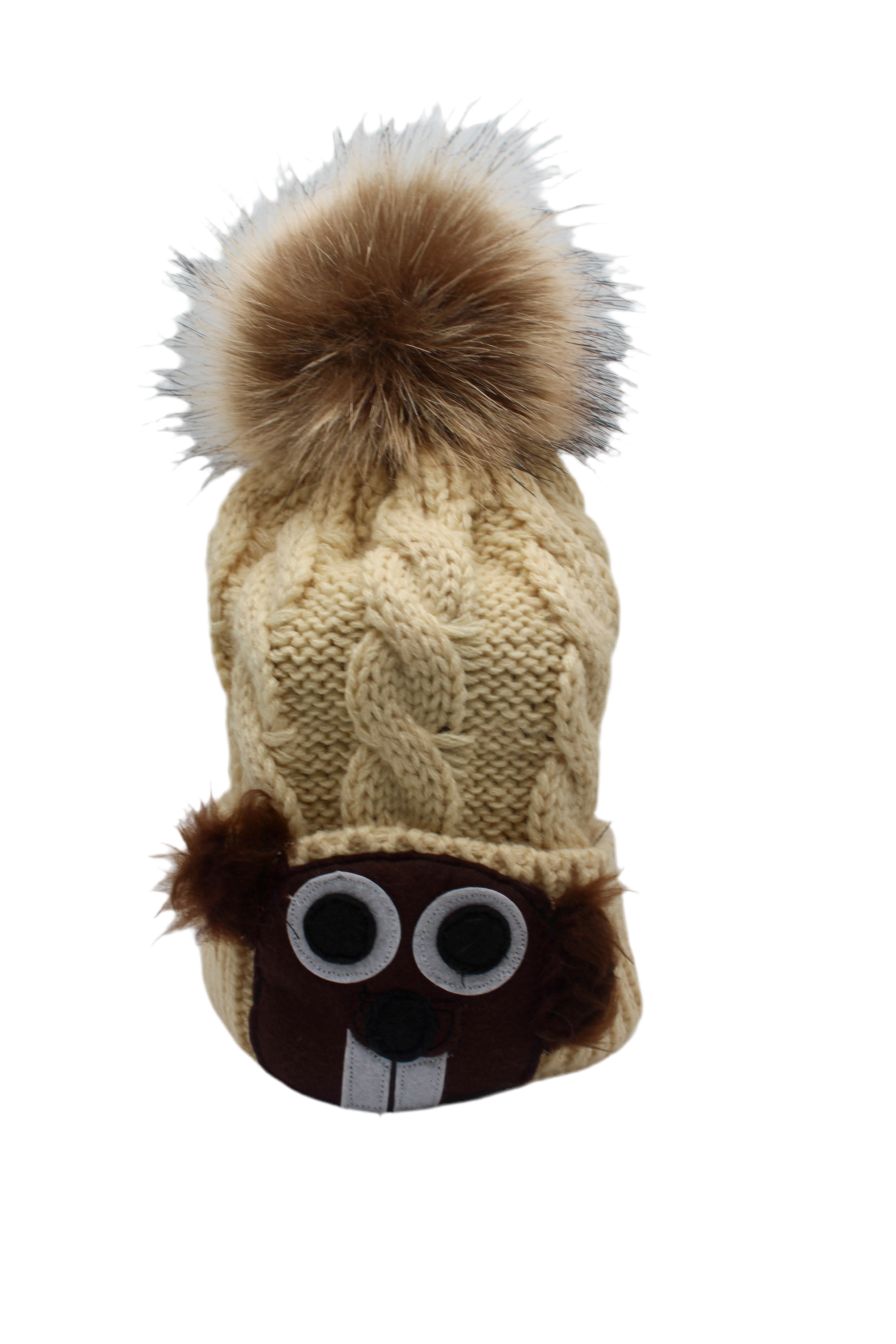 Cozy adult knit pom pom hat in cream with roll-up cuff and an adorable groundhog face. Perfect for Groundhog Day or any chilly day.