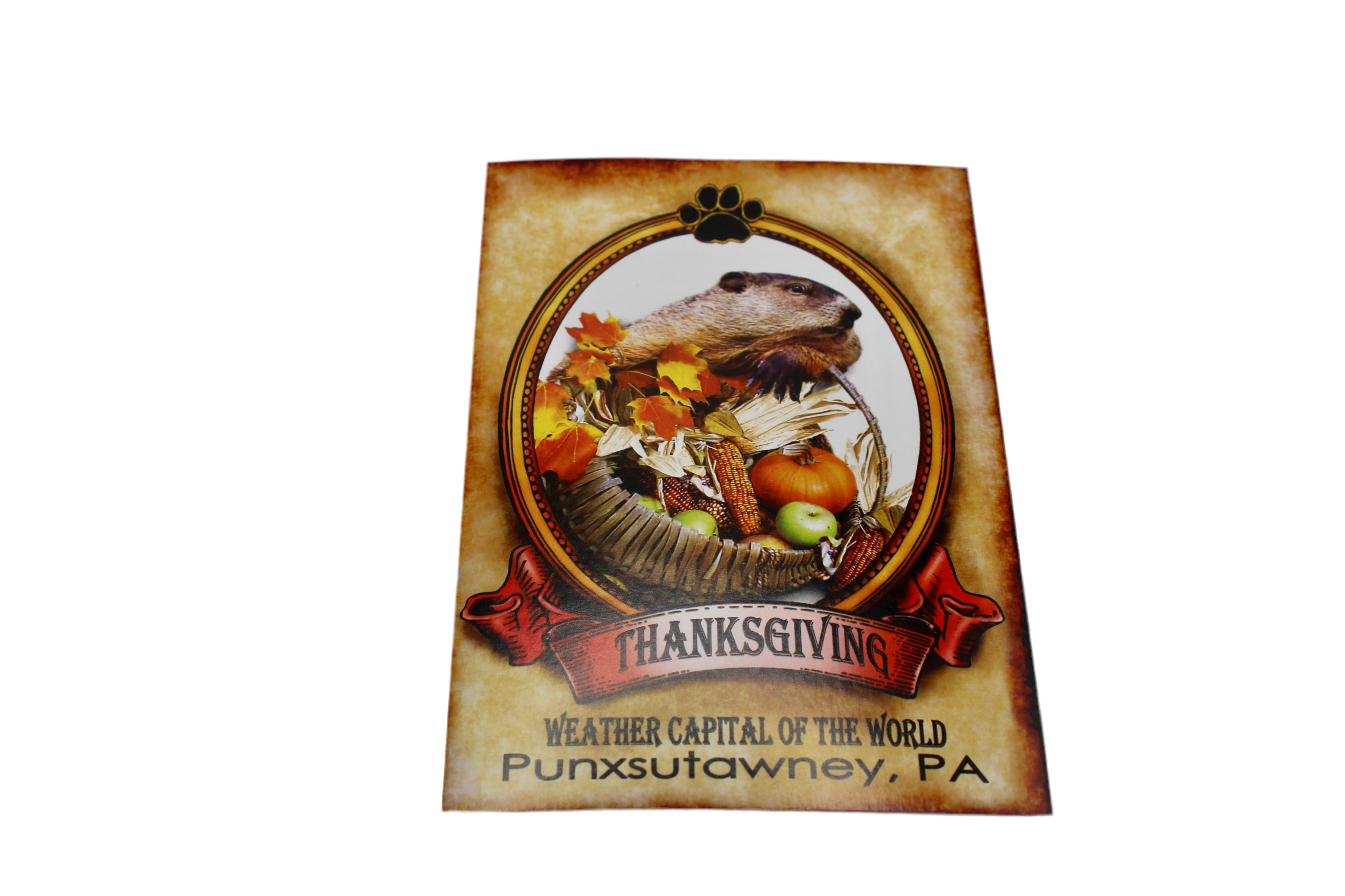 Celebrate Thanksgiving with this framed postcard featuring Punxsutawney Phil. A great seasonal gift or party favor for Groundhog Day enthusiasts and collectors.