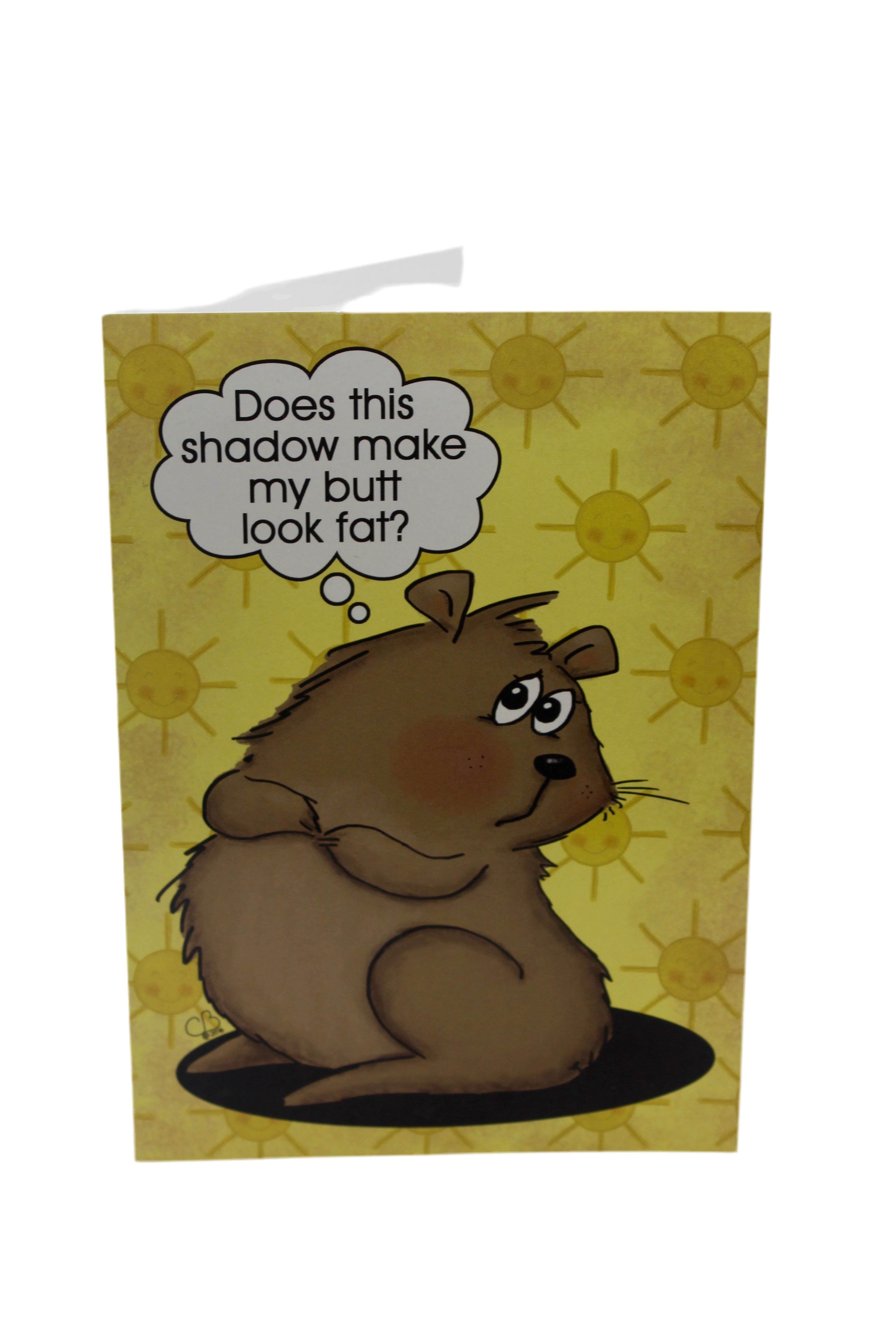This funny Groundhog Day greeting card features a groundhog asking: 'Does this shadow make my butt look fat?' Inside message: 'No matter what, have a Happy Groundhog Day!' A humorous way to celebrate February 2. SKU#1416000.