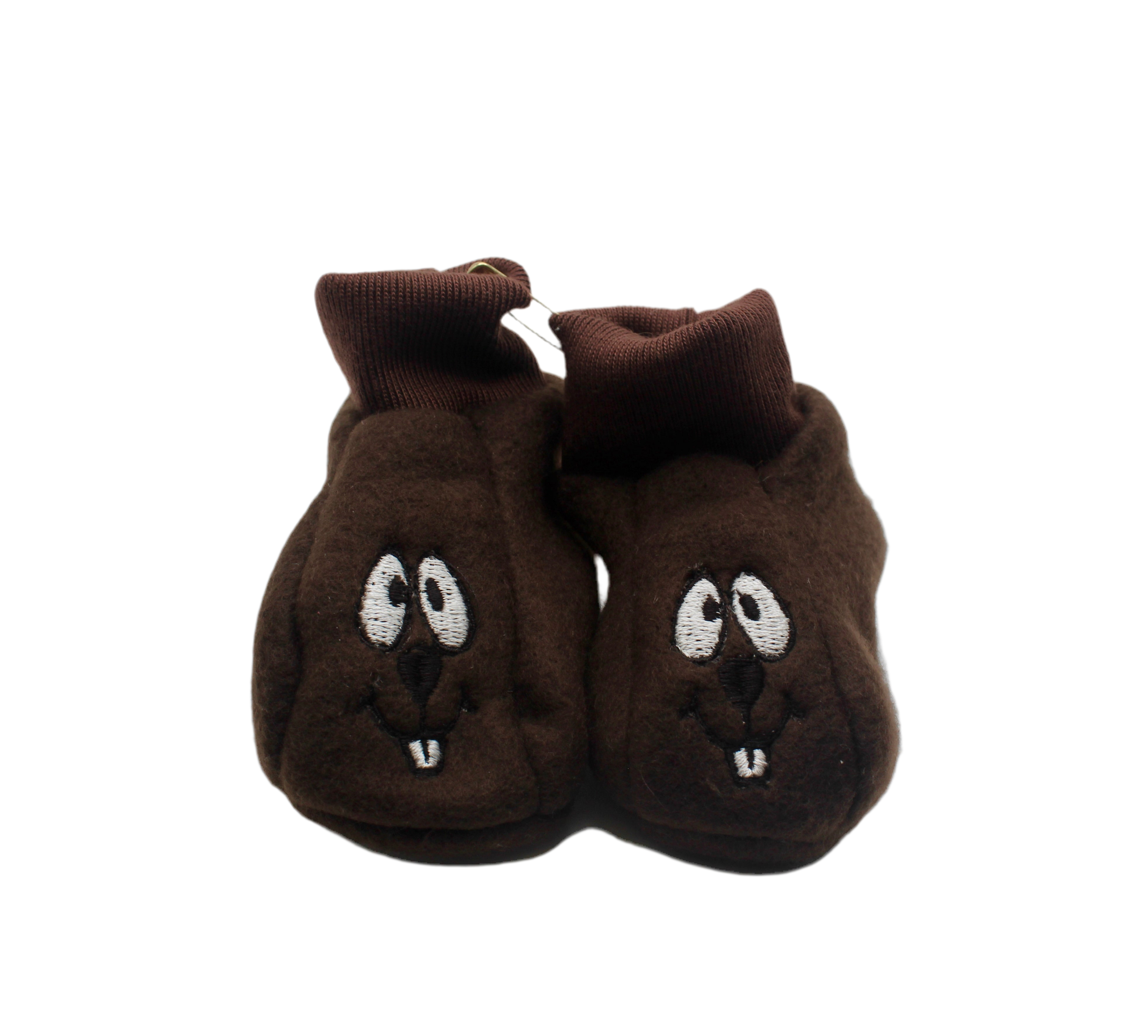 Handmade baby booties with an embroidered groundhog face, ribbed cuff, and adorable tail detail at the back. Approximately 3.5 inches in length—perfectly sized for tiny feet! Coordinates with our baby groundhog hats.
