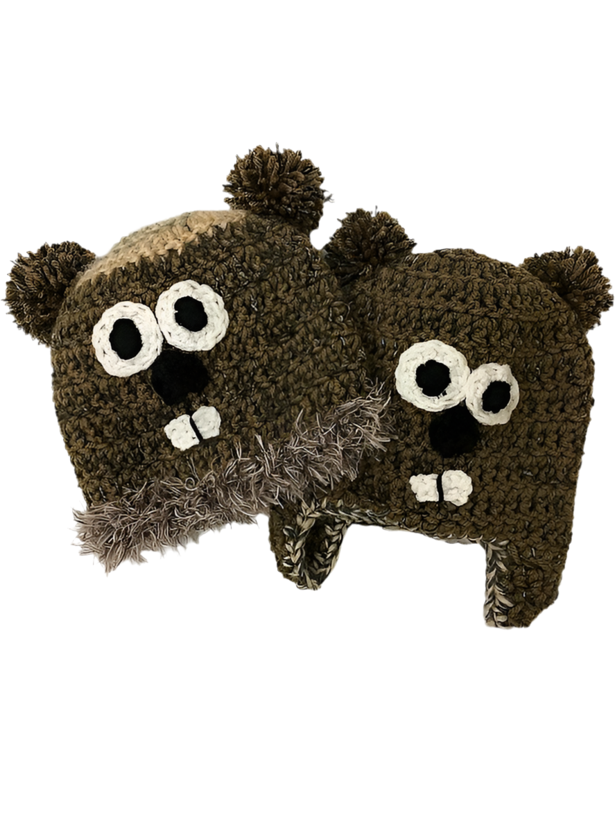 Handmade by a local artisan, this toddler/infant groundhog hat features high-quality craftsmanship in soft brown-toned yarns. Each hat is unique and selected with care. Cozy, cute, and perfect for Groundhog Day or chilly days out.