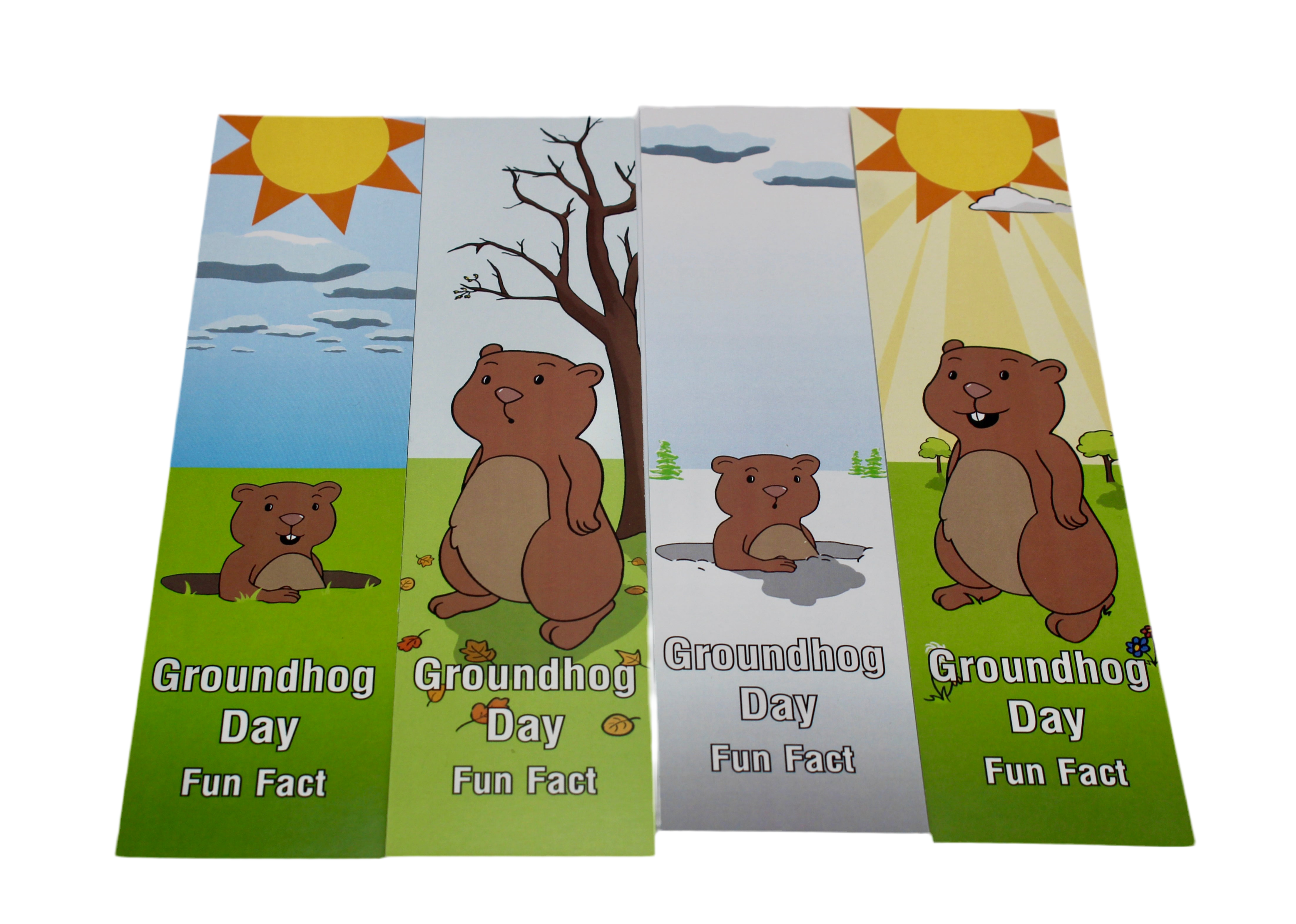 Glossy 8x2 inch cardboard bookmarks featuring fun groundhog facts on the back. There are 4 different designs—our choice. If you order 4 or more, we’ll try to send a variety based on availability. A great classroom or party handout!