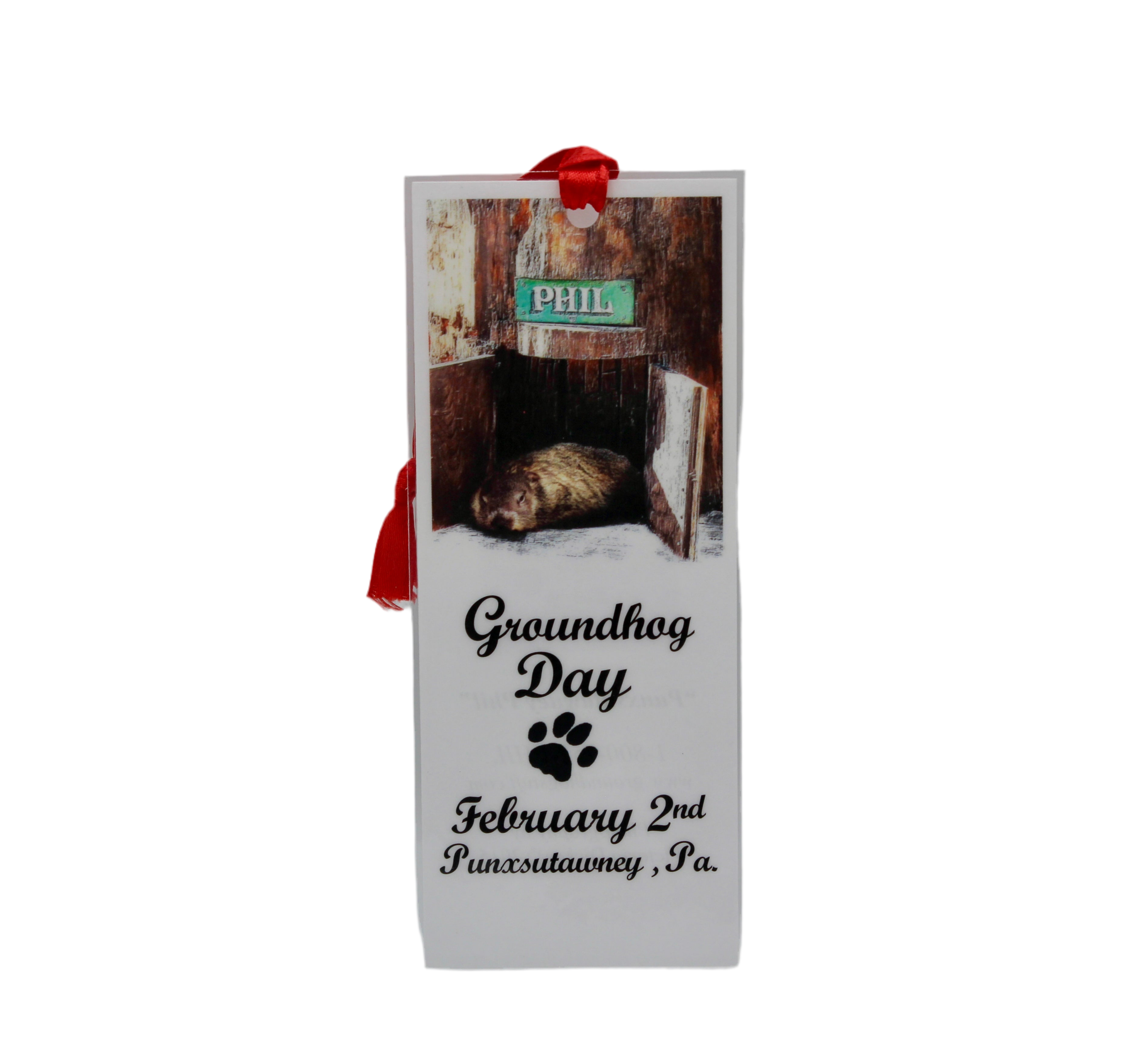 This full-color, plastic-coated bookmark features a vivid photo of Punxsutawney Phil in his cozy burrow. A great party favor or gift for any Groundhog Day celebration!