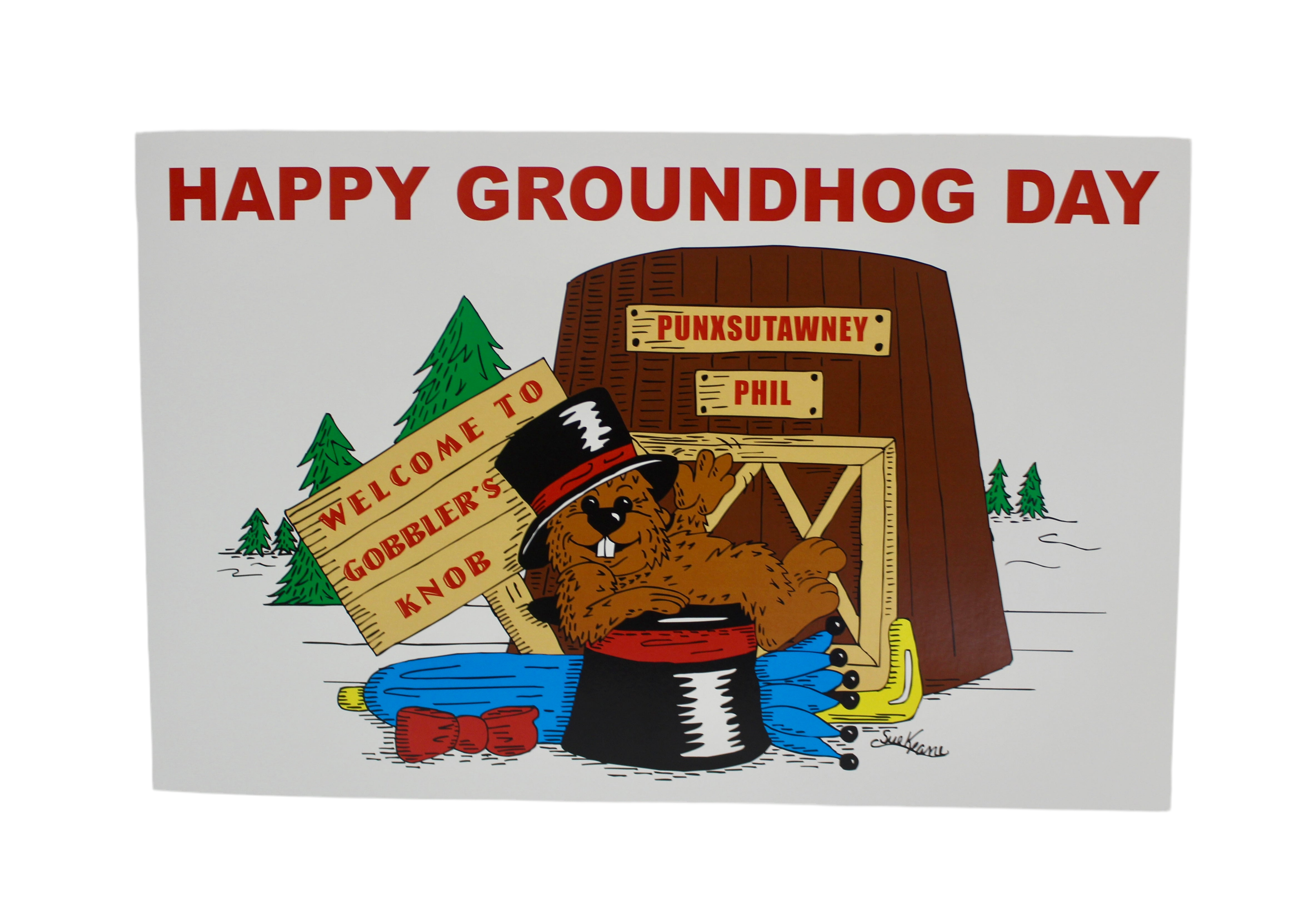 Colorful illustration of Punxsutawney Phil in his burrow at Gobblers Knob on an 11x17-inch poster. A festive and collectible Groundhog Day decoration.