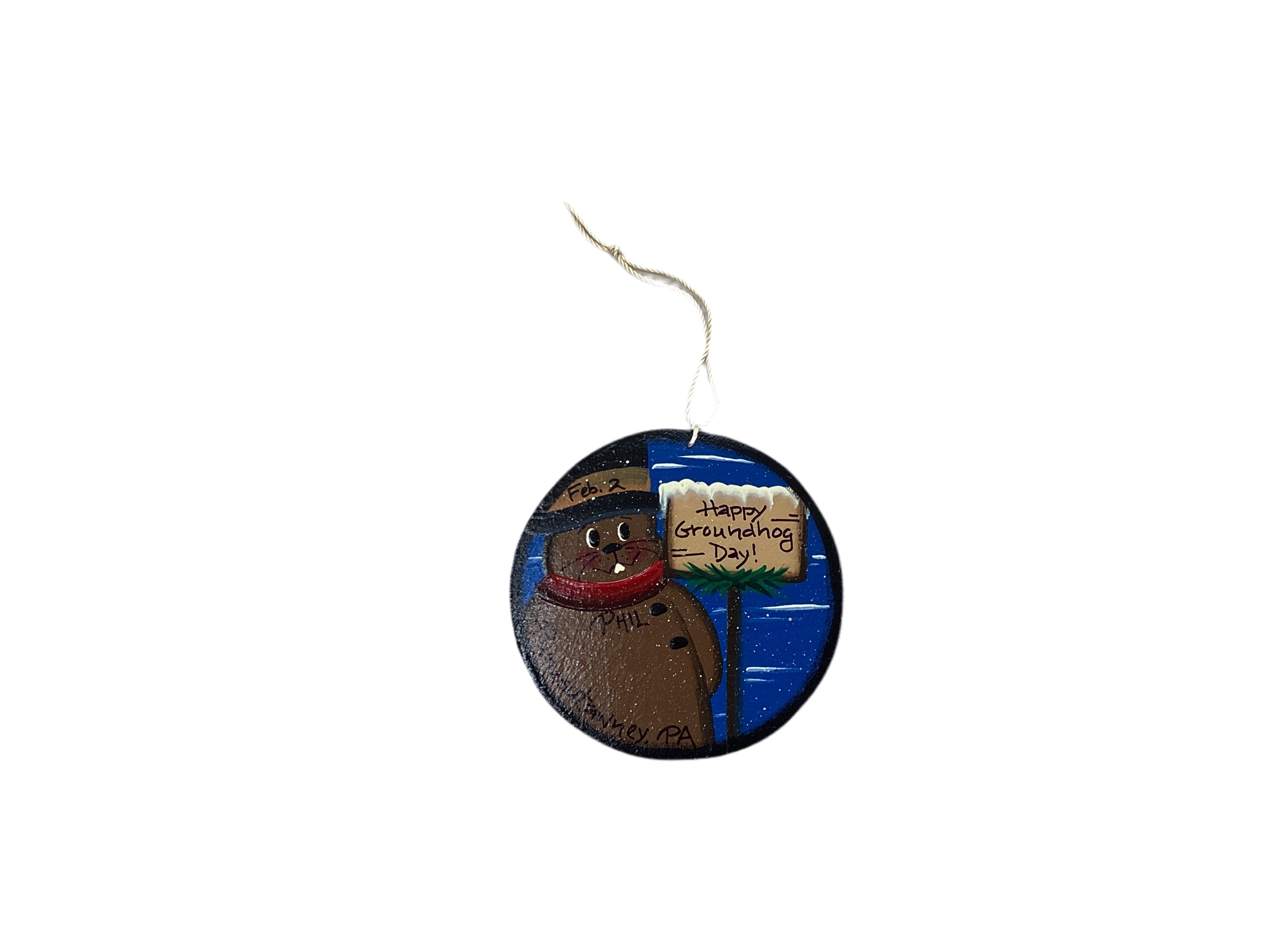 A hand made and painted wood groundhog ornament. What a great ornament for your tree or as a gift.