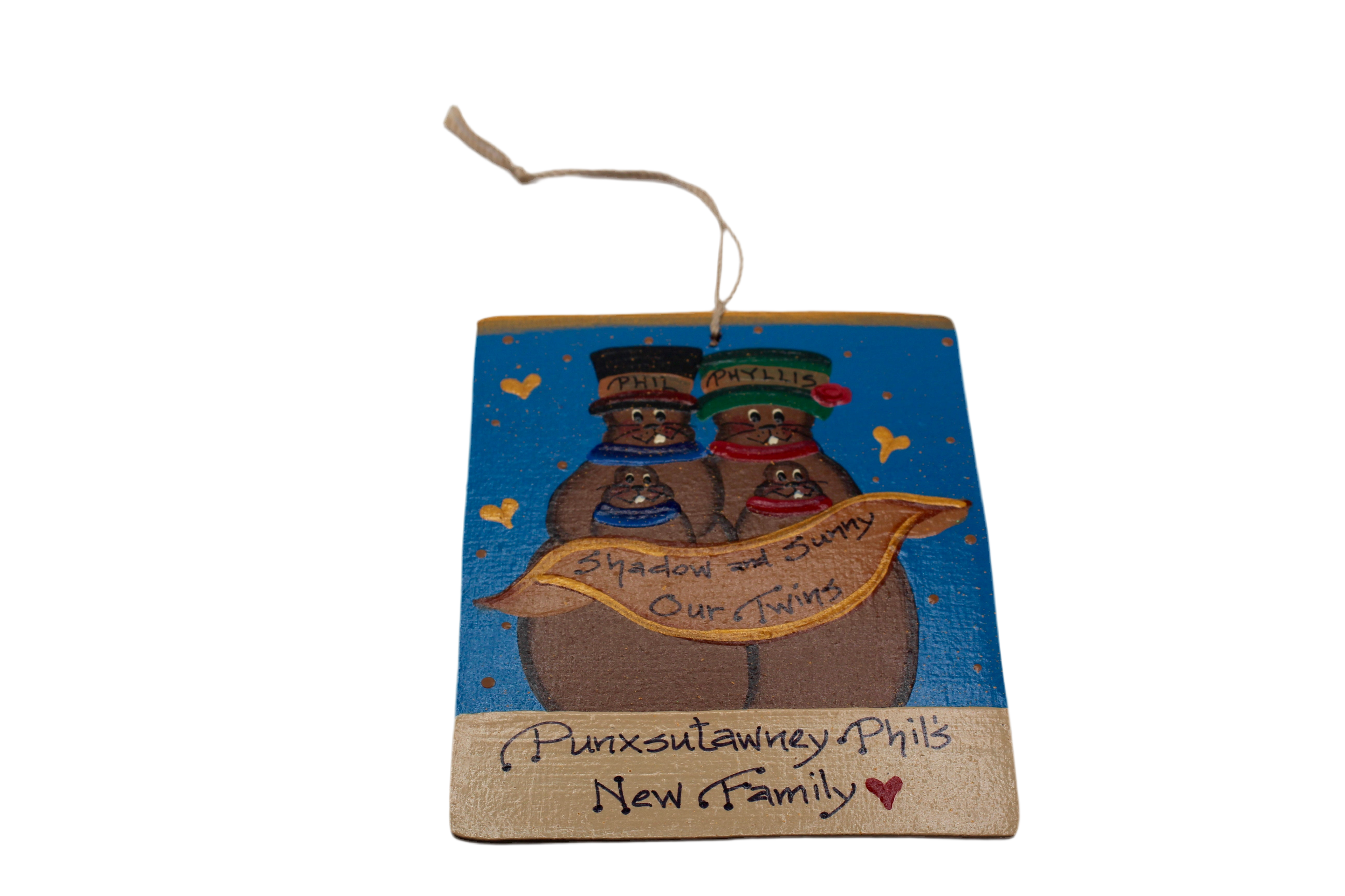 This handpainted ornament features Punxsutawney Phil and his family—Phyllis, Sunny, and Shadow. A festive and collectible piece to celebrate the Groundhog Day tradition.