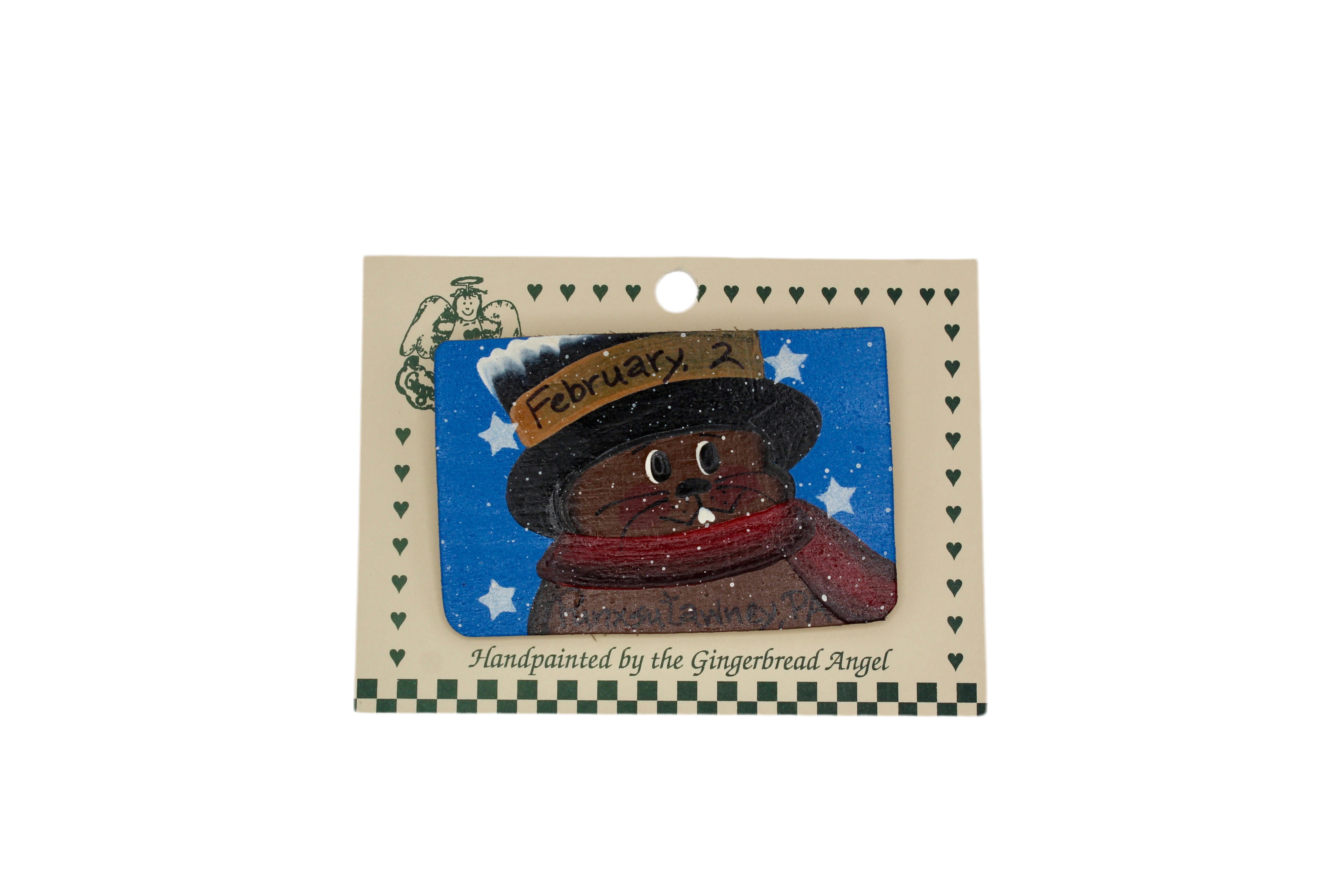 This 2.5 by 2-inch handcrafted rectangle pin features a delightful Punxsutawney Phil design. Made by a local artist, it's a whimsical and collectible accessory for Groundhog Day or any season.
