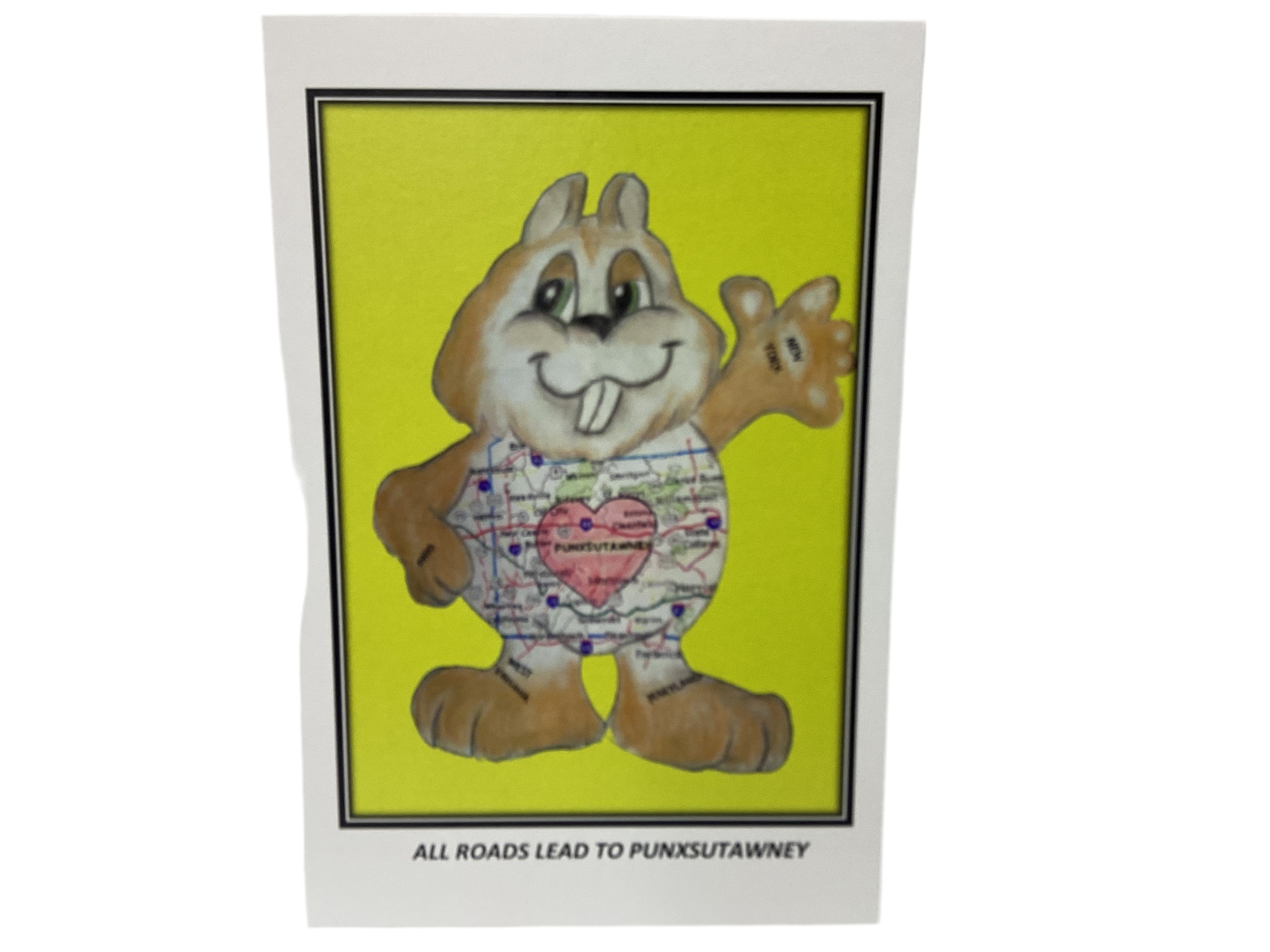 Designed by a local artist, this unique postcard features a Phantastic Phil statue with the message 'All Roads Lead to Punxsutawney.' A charming and collectible piece of Groundhog Day artwork.