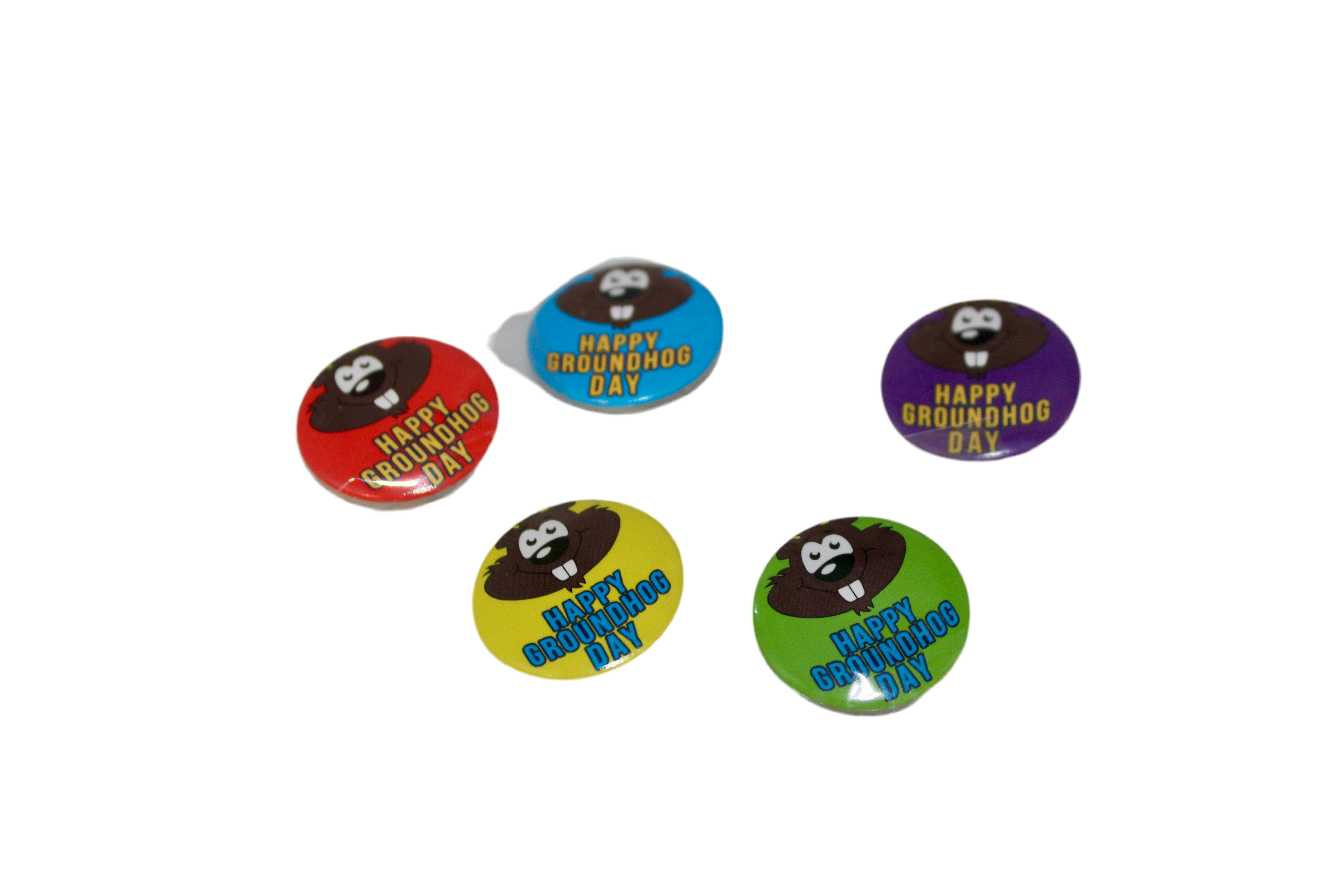 A 1x1 inch mini pin-back button with 'Happy Groundhog Day' message. Comes in assorted colors (our choice). Fun for both kids and adults—perfect for classrooms or party giveaways.