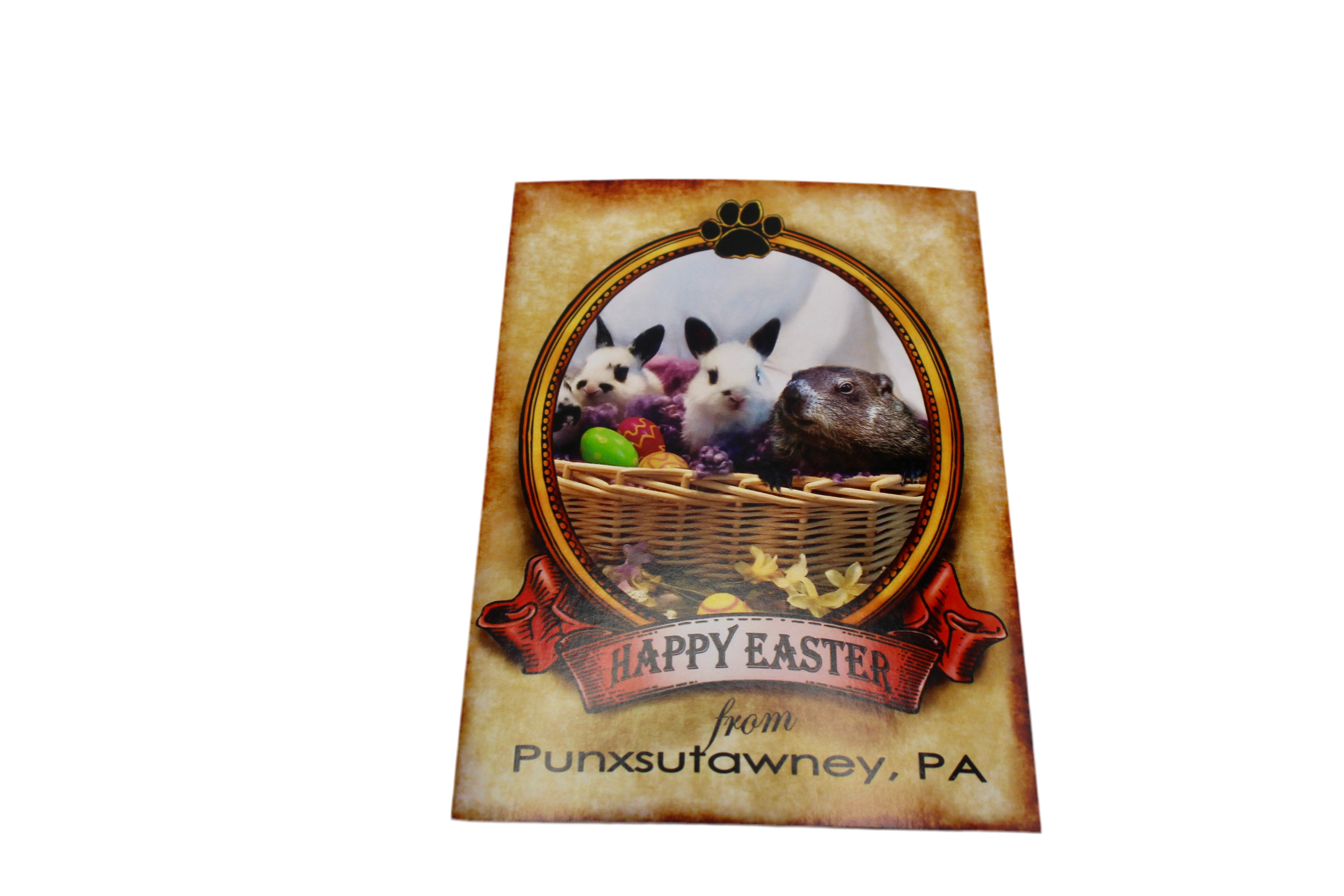 A charming Easter postcard featuring Punxsutawney Phil framed in festive spring detail. Perfect for sending seasonal greetings or as a collector's item.