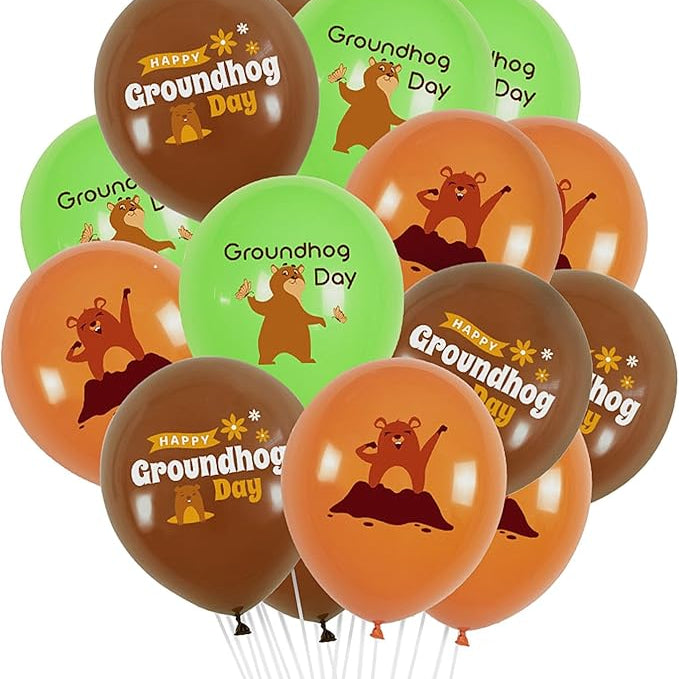 Groundhog balloons 3 different designs. One says Hello Spring, the other 2 say Happy Groundhog Day.