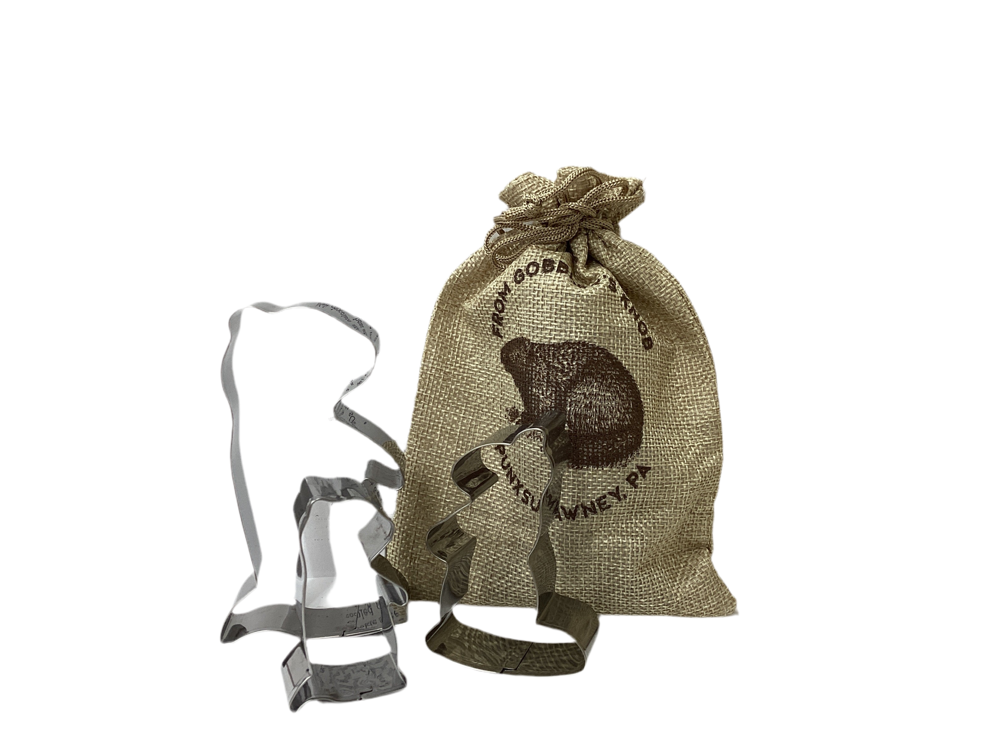 All 3 sizes of our groundhog cookie cutters plus a recipe in a nice burlap bag. Makes a great gift!